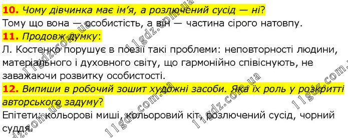 10. Чому дівчинка має ім’я, а розлючений сусід — ні? Тому що вона — особистість, а він — частина сірого натовпу. 11. Продовж думку: Л. Костенко порушує в поезії такі проблеми: неповторності людини, матеріального і духовного світу, що гармонійно співіснують, не заважаючи розвитку особистості. 12. Випиши в робочий зошит художні засоби. Яка їх роль у розкритті авторського задуму? Епітети: кольорові миші, кольоровий кіт, розлючений сусід, чорний суддя.