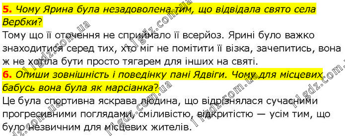 5. Чому Ярина була незадоволена тим, що відвідала свято села Вербки? Тому що її оточення не сприймало її всерйоз. Ярині було важко знаходитися серед тих, хто міг не помітити її візка, зачепитись, вона ж не хотіла бути просто тягарем для інших на святі. 6. Опиши зовнішність і поведінку пані Ядвіги. Чому для місцевих бабусь вона була як марсіанка? Це була спортивна яскрава людина, що відрізнялася сучасними прогресивними поглядами, сміливістю, відкритістю — усім тим, що було незвичним для місцевих жителів.