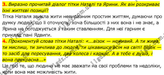 3. Виразно прочитай діалог тітки Наталі та Ярини. Як він розкриває їхні життєві позиції? Тітка Наталя звикла жити невиразним простим життям, думаючи про думку людей, що її оточують, хоча більшості з них вона і не знає, а Ярина не погоджується з таким ставленням. Для неї гарним є приклад пані Ядвиги. 4. Прокоментуй слова тітки Наталі: «...візок — неживий. А ти жива, ти мислиш, ти зичлива до людей, ти цікавишся всім на світі! Візок — то засіб для пересування, два колеса і каркас. А в тебе є душа, і вона прекрасна...» Це про те, що людина не має зважати на свої проблеми та недоліки, коли вона має можливість жити.