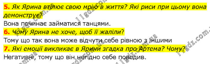 5. Як Ярина втілює свою мрію в життя? Які риси при цьому вона демонструє? Вона починає займатися танцями. 6. Чому Ярина не хоче, щоб її жаліли? Тому що так вона може відчути себе рівною з іншими 7. Які емоції викликає в Ярини згадка про Артема? Чому? Негативні, тому що він негідно себе поводив.