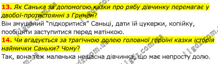 13. Як Санька за допомогою казки про рябу дівчинку перемагає у двобої-протистоянні з Гринем? Він змушений “підкоритися” Саньці, дати їй цукерки, копійку, пообіцяти заступитися перед матінкою. 14. Чи вгадується за трагічною долею головної героїні казки історія наймички Саньки? Чому? Так, вона теж маленька нещасна дівчинка, що має непросту долю.