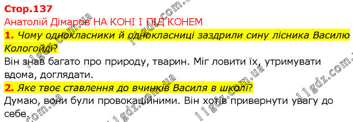 Анатолій Дімаров НА КОНІ І ПІД КОНЕМ 1. Чому однокласники й однокласниці заздрили сину лісника Василю Кологойді? Він знав багато про природу, тварин. Міг ловити їх, утримувати вдома, доглядати. 2. Яке твоє ставлення до вчинків Василя в школі? Думаю, вони були провокаційними. Він хотів привернути увагу до себе.