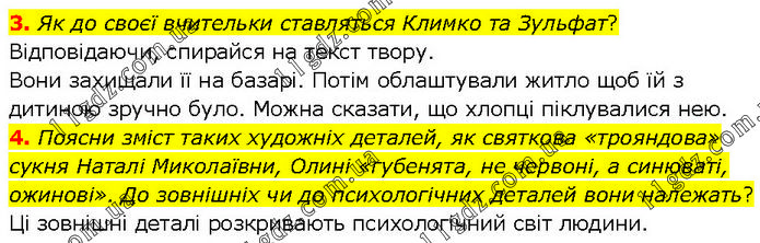 3. Як до своєї вчительки ставляться Климко та Зульфат? Відповідаючи, спирайся на текст твору. Вони захищали її на базарі. Потім облаштували житло щоб їй з дитиною зручно було. Можна сказати, що хлопці піклувалися нею. 4. Поясни зміст таких художніх деталей, як святкова «трояндова» сукня Наталі Миколаївни, Олині «губенята, не червоні, а синюваті, ожинові». До зовнішніх чи до психологічних деталей вони належать? Ці зовнішні деталі розкривають психологічний світ людини.