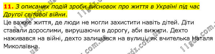 З описаних подій зроби висновок про життя в Україні під час Другої світової війни. Це важке життя, де люди не могли захистити навіть дітей. Діти ставали дорослими, вирушаючи в дорогу, аби вижити. Дехто наживався на війні, дехто залишався на вулиці, як вчителька Наталя Миколаївна.