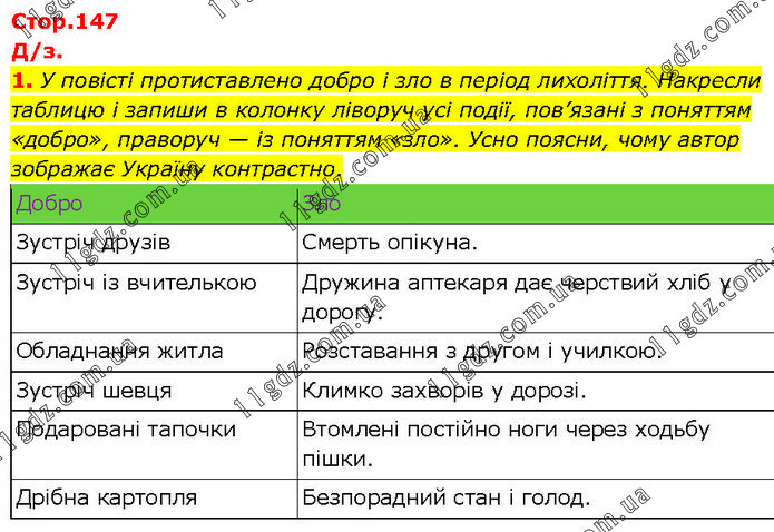 У повісті протиставлено добро і зло в період лихоліття. Накресли таблицю і запиши в колонку ліворуч усі події, пов’язані з поняттям «добро», праворуч — із поняттям «зло». Усно поясни, чому автор зображає Україну контрастно. Добро Зло Зустріч друзів Смерть опікуна. Зустріч із вчителькою Дружина аптекаря дає черствий хліб у дорогу. Обладнання житла Розставання з другом і училкою. Зустріч шевця Климко захворів у дорозі. Подаровані тапочки Втомлені постійно ноги через ходьбу пішки. Дрібна картопля Безпорадний стан і голод.