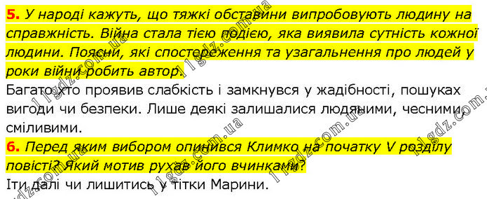 5. У народі кажуть, що тяжкі обставини випробовують людину на справжність. Війна стала тією подією, яка виявила сутність кожної людини. Поясни, які спостереження та узагальнення про людей у роки війни робить автор. Багато хто проявив слабкість і замкнувся у жадібності, пошуках вигоди чи безпеки. Лише деякі залишалися людяними, чесними, сміливими. 6. Перед яким вибором опинився Климко на початку V розділу повісті? Який мотив рухав його вчинками? Іти далі чи лишитись у тітки Марини.
