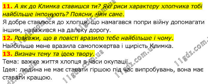 11. А як до Климка ставишся ти? Які риси характеру хлопчика тобі найбільше імпонують? Поясни, чим саме. Я добре ставлюся до хлопця, що намагався попри війну допомагати іншим, наважився на далеку дорогу. 12. Розкажи, що в повісті вразило тебе найбільше і чому. Найбільше мене вразила самопожертва і щирість Климка. 13. Визнач тему та ідею твору. Тема: важке життя хлопця в часи окупації. Ідея: людина не має ставати гіршою під час випробувань, вона має ставати кращою.