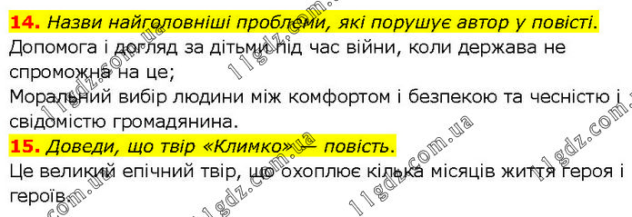 14. Назви найголовніші проблеми, які порушує автор у повісті. Допомога і догляд за дітьми під час війни, коли держава не спроможна на це; Моральний вибір людини між комфортом і безпекою та чесністю і свідомістю громадянина. 15. Доведи, що твір «Климко» — повість. Це великий епічний твір, що охоплює кілька місяців життя героя і героїв.