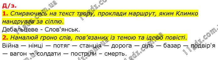 1. Спираючись на текст твору, проклади маршрут, яким Климко мандрував за сіллю. Дебальцеве - Слов'янськ. 2. Намалюй гроно слів, пов’язаних із темою та ідеєю повісті. Війна — німці — потяг — станція — дорога — сіль — базар — подвір'я — вагон — солдати — постріли – смерть.