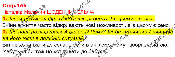 Наталка Малетич ЩОДЕННИК ЕЛЬФА 1. Як ти розумієш фразу «Усе шкереберть. І в цьому є сенс». Зміни в життя часто відкривають нові можливості, а в цьому є сенс. 2. Які події розчарували Андріана? Чому? Як би ти вчинив / вчинила на його місці в подібній ситуації? Він не хотів їхати до села, а бути в англомовному таборі зі Златою. Мабуть, я би теж не хотів їхати до бабусі.