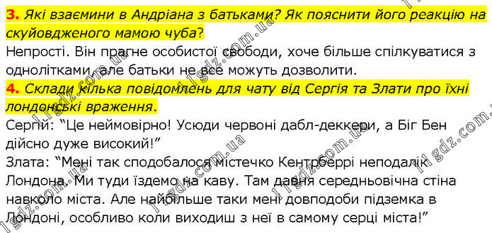 3. Які взаємини в Андріана з батьками? Як пояснити його реакцію на скуйовдженого мамою чуба? Непрості. Він прагне особистої свободи, хоче більше спілкуватися з однолітками, але батьки не все можуть дозволити. 4. Склади кілька повідомлень для чату від Сергія та Злати про їхні лондонські враження. Сергій: “Це неймовірно! Усюди червоні дабл-деккери, а Біг Бен дійсно дуже високий!” Злата: “Мені так сподобалося містечко Кентрберрі неподалік Лондона. Ми туди їздемо на каву. Там давня середньовічна стіна навколо міста. Але найбільше таки мені довподоби підземка в Лондоні, особливо коли виходиш з неї в самому серці міста!”