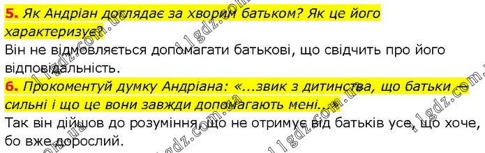 5. Як Андріан доглядає за хворим батьком? Як це його характеризує? Він не відмовляється допомагати батькові, що свідчить про його відповідальність. 6. Прокоментуй думку Андріана: «...звик з дитинства, що батьки —сильні і що це вони завжди допомагають мені...» Так він дійшов до розуміння, що не отримує від батьків усе, що хоче, бо вже дорослий.