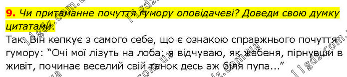 Чи притаманне почуття гумору оповідачеві? Доведи свою думку цитатами. Так. Він кепкує з самого себе, що є ознакою справжнього почуття гумору: “Очі мої лізуть на лоба: я відчуваю, як жабеня, пірнувши в живіт, починає веселий свій танок десь аж біля пупа...”
