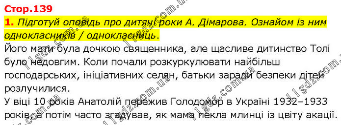 1. Підготуй оповідь про дитячі роки А. Дімарова. Ознайом із ним однокласників / однокласниць. Його мати була дочкою священника, але щасливе дитинство Толі було недовгим. Коли почали розкуркулювати найбільш господарських, ініціативних селян, батьки заради безпеки дітей розлучилися. У віці 10 років Анатолій пережив Голодомор в Україні 1932–1933 років, а потім часто згадував, як мама пекла млинці із цвіту акації.
