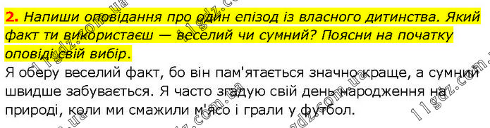 Напиши оповідання про один епізод із власного дитинства. Який факт ти використаєш — веселий чи сумний? Поясни на початку оповіді свій вибір. Я оберу веселий факт, бо він пам'ятається значно краще, а сумний швидше забувається. Я часто згадую свій день народження на природі, коли ми смажили м'ясо і грали у футбол.
