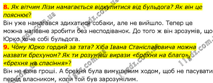 8. Як вітчим Лізи намагається відкупитися від бульдога? Як він це пояснює? Він уже намагався здихатися собаки, але не вийшло. Тепер це можна напевне зробити без несподіванок. До того ж він зрозумів, що Юрко хоче собі бульдога. 9. Чому Юрко гордий за тата? Хіба Івана Станіславовича можна назвати брехуном? Як ти розумієш вирази «брехня на благо», «брехня на спасіння»? Він не взяв гроші. А брехня була вимушеним ходом, щоб не пасувати перед власником, коли той був зарозумілим.