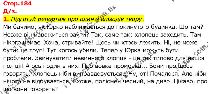 1. Підготуй репортаж про один з епізодів твору. Ми бачимо, як Юрко наближається до покинутого будинка. Що там? Невже він наважиться зайти? Так, саме так: хлопець заходить. Там нікого немає. Хоча, стривайте! Щось чи хтось лежить. Ні, не може бути: це труп! Тут когось убили. Тепер у Юрка можуть бути проблеми. Звинуватити невинного хлопця - це так типово для нашої поліції! А ось і один з них. Про вовка промовка... Вони про щось говорять. Хлопець ніби виправдовується.. Ну, от! Почалося. Але ніби нічого не відбувається. Схоже, полісмен чесний, на диво. Цікаво, про що вони говорять?