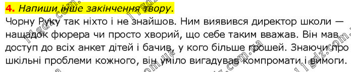 Напиши інше закінчення твору. Чорну Руку так ніхто і не знайшов. Ним виявився директор школи — нащадок фюрера чи просто хворий, що себе таким вважав. Він мав доступ до всіх анкет дітей і бачив, у кого більше грошей. Знаючи про шкільні проблеми кожного, він уміло вигадував компромати і вимоги.