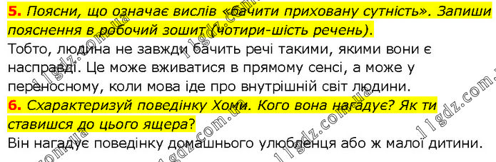 5. Поясни, що означає вислів «бачити приховану сутність». Запиши пояснення в робочий зошит (чотири-шість речень). Тобто, людина не завжди бачить речі такими, якими вони є насправді. Це може вживатися в прямому сенсі, а може у переносному, коли мова іде про внутрішній світ людини. 6. Схарактеризуй поведінку Хоми. Кого вона нагадує? Як ти ставишся до цього ящера? Він нагадує поведінку домашнього улюбленця або ж малої дитини.