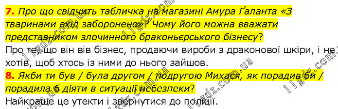 7. Про що свідчить табличка на магазині Амура Ґаланта «З тваринами вхід заборонено»? Чому його можна вважати представником злочинного браконьєрського бізнесу? Про те, що він вів бізнес, продаючи вироби з драконової шкіри, і не хотів, щоб хтось із ними до нього зайшов. 8. Якби ти був / була другом / подругою Михася, як порадив би / порадила б діяти в ситуації небезпеки? Найкраще це утекти і звернутися до поліції.