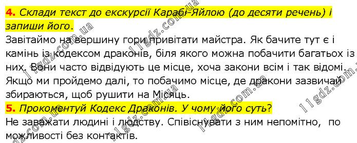 4. Склади текст до екскурсії Карабі-Яйлою (до десяти речень) і запиши його. Завітаймо на вершину гори привітати майстра. Як бачите тут є і камінь із кодексом драконів, біля якого можна побачити багатьох із них. Вони часто відвідують це місце, хоча закони всім і так відомі. Якщо ми пройдемо далі, то побачимо місце, де дракони зазвичай збираються, щоб рушити на Місяць. 5. Прокоментуй Кодекс Драконів. У чому його суть? Не заважати людині і людству. Співіснувати з ним непомітно, по можливості без контактів.