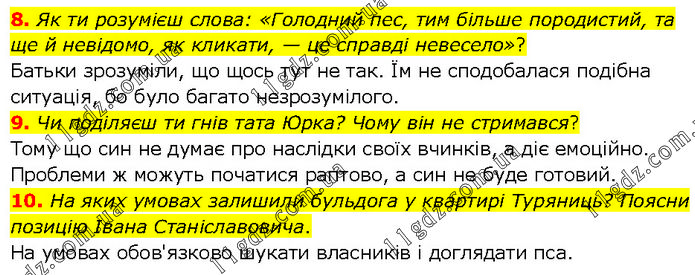 8. Як ти розумієш слова: «Голодний пес, тим більше породистий, та ще й невідомо, як кликати, — це справді невесело»? Батьки зрозуміли, що щось тут не так. Їм не сподобалася подібна ситуація, бо було багато незрозумілого. 9. Чи поділяєш ти гнів тата Юрка? Чому він не стримався? Тому що син не думає про наслідки своїх вчинків, а діє емоційно. Проблеми ж можуть початися раптово, а син не буде готовий. 10. На яких умовах залишили бульдога у квартирі Туряниць? Поясни позицію Івана Станіславовича. На умовах обов'язково шукати власників і доглядати пса.