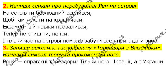 2. Напиши сенкан про перебування Яви на острові. На острів ти безлюдний оселився, Щоб там чекати на кращі часи, Екзамен твій навіки провалився, Тепер не спиш ти, не їси. І тільки час на острові поможе забути все і пригадати знов. 3. Запиши рекламне гасло фільму «Тореадори з Васюківки». Намалюй символ твору та прокоментуй його. Вони — справжні тореадори! Тільки не з і Іспанії, а з України!