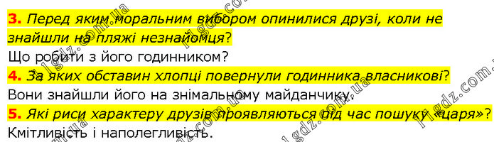 3. Перед яким моральним вибором опинилися друзі, коли не знайшли на пляжі незнайомця? Що робити з його годинником? 4. За яких обставин хлопці повернули годинника власникові? Вони знайшли його на знімальному майданчику. 5. Які риси характеру друзів проявляються під час пошуку «царя»? Кмітливість і наполегливість.