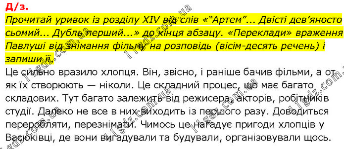 Прочитай уривок із розділу XIV від слів «“Артем”... Двісті дев’яносто сьомий... Дубль перший...» до кінця абзацу. «Переклади» враження Павлуші від знімання фільму на розповідь (вісім-десять речень) і запиши її. Це сильно вразило хлопця. Він, звісно, і раніше бачив фільми, а от як їх створюють — ніколи. Це складний процес, що має багато складових. Тут багато залежить від режисера, акторів, робітників студії. Далеко не все в них виходить із першого разу. Доводиться переробляти, перезнімати. Чимось це нагадує пригоди хлопців у Васюківці, де вони вигадували та будували, організовували щось.