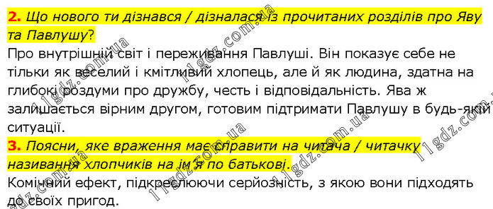 2. Що нового ти дізнався / дізналася із прочитаних розділів про Яву та Павлушу? Про внутрішній світ і переживання Павлуші. Він показує себе не тільки як веселий і кмітливий хлопець, але й як людина, здатна на глибокі роздуми про дружбу, честь і відповідальність. Ява ж залишається вірним другом, готовим підтримати Павлушу в будь-якій ситуації. 3. Поясни, яке враження має справити на читача / читачку називання хлопчиків на ім’я по батькові. Комічний ефект, підкреслюючи серйозність, з якою вони підходять до своїх пригод.