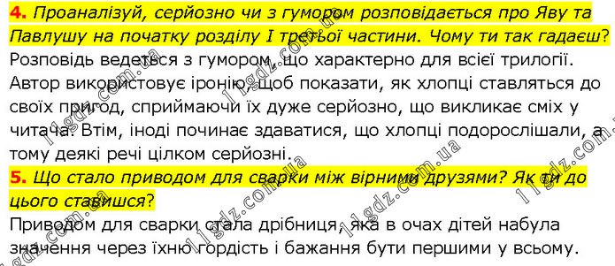 4. Проаналізуй, серйозно чи з гумором розповідається про Яву та Павлушу на початку розділу І третьої частини. Чому ти так гадаєш? Розповідь ведеться з гумором, що характерно для всієї трилогії. Автор використовує іронію, щоб показати, як хлопці ставляться до своїх пригод, сприймаючи їх дуже серйозно, що викликає сміх у читача. Втім, іноді починає здаватися, що хлопці подорослішали, а тому деякі речі цілком серйозні. 5. Що стало приводом для сварки між вірними друзями? Як ти до цього ставишся? Приводом для сварки стала дрібниця, яка в очах дітей набула значення через їхню гордість і бажання бути першими у всьому.