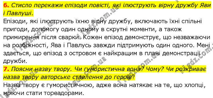 6. Стисло перекажи епізоди повісті, які ілюструють вірну дружбу Яви і Павлуші. Епізоди, які ілюструють їхню вірну дружбу, включають їхні спільні пригоди, допомогу один одному в скрутні моменти, а також примирення після сварки. Кожен епізод демонструє, що незважаючи на розбіжності, Ява і Павлусь завжди підтримують один одного. Мені здається, що епізод з островом є найкращим в плані демонстрації дружби. 7. Поясни назву твору. Чи гумористична вона? Чому? Чи розкриває назва твору авторське ставлення до героїв? Назва твору є гумористичною, адже вона натякає на те, що хлопці, мріючи стати тореадорами.