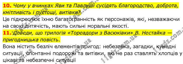10. Чому у вчинках Яви та Павлуші сусідять благородство, доброта, кмітливість і пустощі, витівки? Це підкреслює їхню багатогранність як персонажів, які, незважаючи на свою дитячість, мають сильні моральні якості. 11. Доведи, що трилогія «Тореадори з Васюківки» В. Нестайка — пригодницька повість. Вона містить безліч елементів пригод: небезпека, загадки, кумедні ситуації, спонтанні подорожі та витівки, які не раз ставлять хлопців у цікаві та небезпечні ситуації.