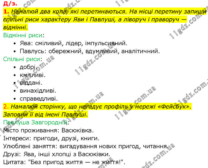 1. Намалюй два кола, які перетинаються. На місці перетину запиши спільні риси характеру Яви і Павлуші, а ліворуч і праворуч — відмінні. Відмінні риси: • Ява: сміливий, лідер, імпульсивний. • Павлусь: обережний, вдумливий, аналітичний. Спільні риси: • добрі. • кмітливі. • віддані. • винахідливі. • справедливі. 2. Намалюй сторінку, що нагадує профіль у мережі «Фейсбук». Заповни її від імені Павлуші. Павлуша Завгородній: Місто проживання: Васюківка. Інтереси: пригоди, друзі, книги. Улюблені заняття: вигадування нових пригод, читання. Друзі: Ява, інші хлопці з Васюківки. Цитата: "Без пригод життя — не життя!".