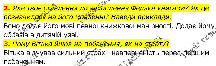 2. Яке твоє ставлення до захоплення Федька книгами? Як це позначилося на його мовленні? Наведи приклади. Воно додає його мові певної книжкової манірності. Додає йому образів в дитячій уяві. 3. Чому Вітька йшов на побачення, як на страту? Вітька відчував сильний страх і невпевненість перед першим побаченням.