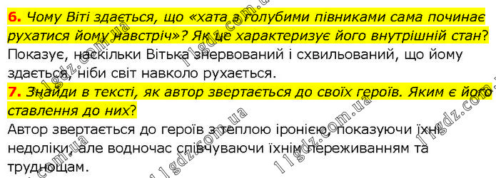 6. Чому Віті здається, що «хата з голубими півниками сама починає рухатися йому навстріч»? Як це характеризує його внутрішній стан? Показує, наскільки Вітька знервований і схвильований, що йому здається, ніби світ навколо рухається. 7. Знайди в тексті, як автор звертається до своїх героїв. Яким є його ставлення до них? Автор звертається до героїв з теплою іронією, показуючи їхні недоліки, але водночас співчуваючи їхнім переживанням та труднощам.