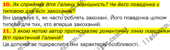 10. Як сприймає Вітя Галину зовнішність? Чи його поведінка є типовою для всіх закоханих? Він ідеалізує її, як часто роблять закохані. Його поведінка цілком типова для тих, хто вперше закоханий. 11. З якою метою автор протиставляє романтичну лінію поведінки Віті практичній Галиній? Це допомагає підкреслити їхні характерні особливості.