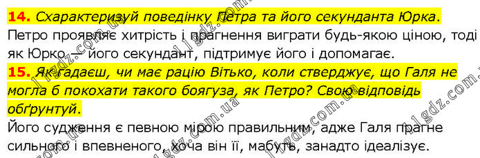 14. Схарактеризуй поведінку Петра та його секунданта Юрка. Петро проявляє хитрість і прагнення виграти будь-якою ціною, тоді як Юрко — його секундант, підтримує його і допомагає. 15. Як гадаєш, чи має рацію Вітько, коли стверджує, що Галя не могла б покохати такого боягуза, як Петро? Свою відповідь обґрунтуй. Його судження є певною мірою правильним, адже Галя прагне сильного і впевненого, хоча він її, мабуть, занадто ідеалізує.