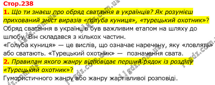 1. Що ти знаєш про обряд сватання в українців? Як розумієш прихований зміст виразів «голуба куниця», «турецький охотник»? Обряд сватання в українців був важливим етапом на шляху до шлюбу. Він складався з кількох частин. «Голуба куниця» — це вислів, що означає наречену, яку «ловлять» або сватають. «Турецький охотник» — позначення свата. 2. Правилам якого жанру відповідає перший рядок із розділу «Турецький охотник»? Гумористичного жанру або жанру жартівливої розповіді.