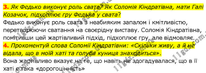 3. Як Федько виконує роль свата? Як Соломія Кіндратівна, мати Галі Козачок, підхоплює гру Федька у свата? Федько виконує роль свата з неабияким запалом і кмітливістю, перетворюючи сватання на своєрідну виставу. Соломія Кіндратівна, помітивши цей жартівливий підхід, підхоплює гру, але відмовляє. 4. Прокоментуй слова Соломії Кіндратівни: «Скільки живу, а й не відала, що в моїй хаті та голуба куниця знаходиться». Вона жартівливо вказує на те, що навіть не здогадувалася, що в її хаті є така «дорогоцінність»