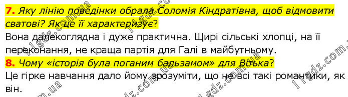 7. Яку лінію поведінки обрала Соломія Кіндратівна, щоб відмовити сватові? Як це її характеризує? Вона далекоглядна і дуже практична. Щирі сільські хлопці, на її переконання, не краща партія для Галі в майбутньому. 8. Чому «історія була поганим бальзамом» для Вітька? Це гірке навчання дало йому зрозуміти, що не всі такі романтики, як він.