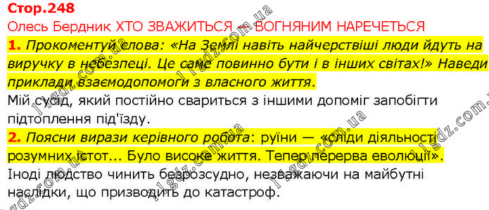 Олесь Бердник ХТО ЗВАЖИТЬСЯ — ВОГНЯНИМ НАРЕЧЕТЬСЯ 1. Прокоментуй слова: «На Землі навіть найчерствіші люди йдуть на виручку в небезпеці. Це саме повинно бути і в інших світах!» Наведи приклади взаємодопомоги з власного життя. Мій сусід, який постійно свариться з іншими допоміг запобігти підтоплення під'їзду. 2. Поясни вирази керівного робота: руїни — «сліди діяльності розумних істот... Було високе життя. Тепер перерва еволюції». Іноді людство чинить безрозсудно, незважаючи на майбутні наслідки, що призводить до катастроф.