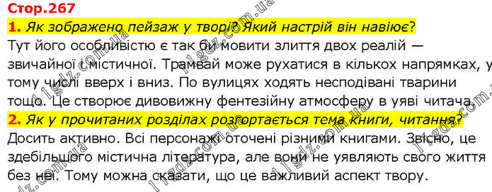 1. Як зображено пейзаж у творі? Який настрій він навіює? Тут його особливістю є так би мовити злиття двох реалій — звичайної і містичної. Трамвай може рухатися в кількох напрямках, у тому числі вверх і вниз. По вулицях ходять несподівані тварини тощо. Це створює дивовижну фентезійну атмосферу в уяві читача. 2. Як у прочитаних розділах розгортається тема книги, читання? Досить активно. Всі персонажі оточені різними книгами. Звісно, це здебільшого містична література, але вони не уявляють свого життя без неї. Тому можна сказати, що це важливий аспект твору.