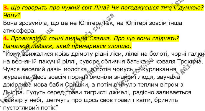 3. Що говорить про чужий світ Ліна? Чи погоджуєшся ти з її думкою? Чому? Вона зрозуміла, що це не Юпітер. Так, на Юпітері зовсім інша атмосфера. 4. Проаналізуй сонні видіння Славка. Про що вони свідчать? Намалюй пейзаж, який примарився хлопцю. “Йому ввижалися крізь дрімоту рідні ліси, лілеї на болоті, чорні галки на весняній пахучій ріллі, суворе обличчя батька — коваля Трохима. Чувся веселий дзвін молотка, а потім чомусь — курликання журавлів. Десь зовсім поряд гомоніли знайомі люди, звучала докірлива мова баби Оришки, а потім війнуло теплим вітром з Дніпра. Гудуть серед трави тигристі джмелі, радісно заливається жайвір у небі, шепчуть про щось своє трави і квіти, бринить пустотливий потік”