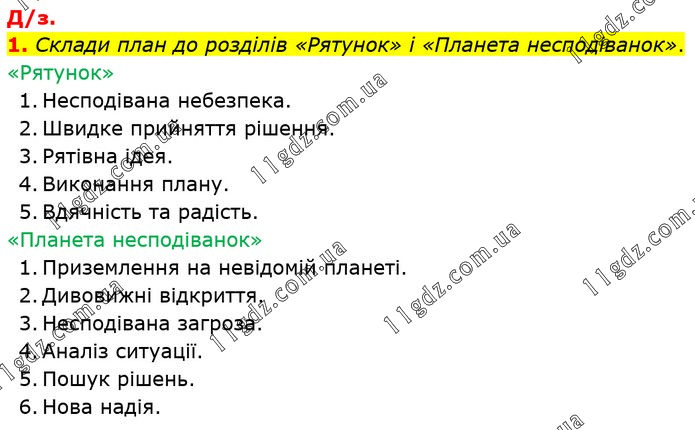 Склади план до розділів «Рятунок» і «Планета несподіванок». «Рятунок» 1. Несподівана небезпека. 2. Швидке прийняття рішення. 3. Рятівна ідея. 4. Виконання плану. 5. Вдячність та радість. «Планета несподіванок» 1. Приземлення на невідомій планеті. 2. Дивовижні відкриття. 3. Несподівана загроза. 4. Аналіз ситуації. 5. Пошук рішень. 6. Нова надія.