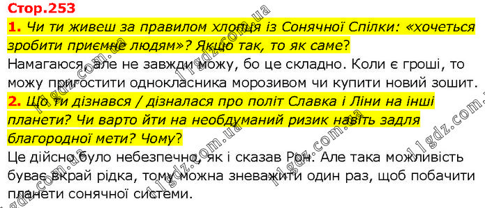 1. Чи ти живеш за правилом хлопця із Сонячної Спілки: «хочеться зробити приємне людям»? Якщо так, то як саме? Намагаюся, але не завжди можу, бо це складно. Коли є гроші, то можу пригостити однокласника морозивом чи купити новий зошит. 2. Що ти дізнався / дізналася про політ Славка і Ліни на інші планети? Чи варто йти на необдуманий ризик навіть задля благородної мети? Чому? Це дійсно було небезпечно, як і сказав Рон. Але така можливість буває вкрай рідка, тому можна зневажити один раз, щоб побачити планети сонячної системи.