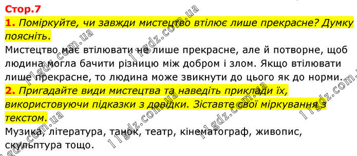 1. Поміркуйте, чи завжди мистецтво втілює лише прекрасне? Думку поясніть. Мистецтво має втілювати не лише прекрасне, але й потворне, щоб людина могла бачити різницю між добром і злом. Якщо втілювати лише прекрасне, то людина може звикнути до цього як до норми. 2. Пригадайте види мистецтва та наведіть приклади їх, використовуючи підказки з довідки. Зіставте свої міркування з текстом. Музика, література, танок, театр, кінематограф, живопис, скульптура тощо.