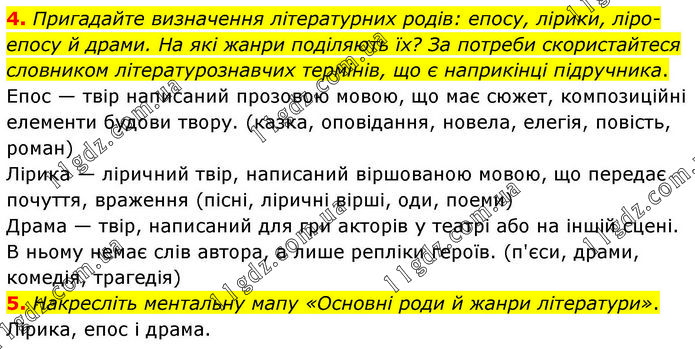 4. Пригадайте визначення літературних родів: епосу, лірики, ліро-епосу й драми. На які жанри поділяють їх? За потреби скористайтеся словником літературознавчих термінів, що є наприкінці підручника. Епос — твір написаний прозовою мовою, що має сюжет, композиційні елементи будови твору. (казка, оповідання, новела, елегія, повість, роман) Лірика — ліричний твір, написаний віршованою мовою, що передає почуття, враження (пісні, ліричні вірші, оди, поеми) Драма — твір, написаний для гри акторів у театрі або на іншій сцені. В ньому немає слів автора, а лише репліки героїв. (п'єси, драми, комедія, трагедія) 5. Накресліть ментальну мапу «Основні роди й жанри літератури». Лірика, епос і драма.