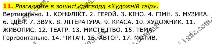 Розгадайте в зошиті кросворд «Художній твір». Вертикально. 1. КОНФЛІКТ. 2. ГЕРОЙ. 3. КІНО. 4. ГІМН. 5. МУЗИКА. 6. ІДЕЯ. 7. ЗВУК. 8. ЛІТЕРАТУРА. 9. КРАСА. 10. ХУДОЖНИК. 11. ЖИВОПИС. 12. ТЕАТР. 13. МИСТЕЦТВО. 15. ТЕМА. Горизонтально. 14. ЧИТАЧ. 16. АВТОР. 17. МОТИВ.