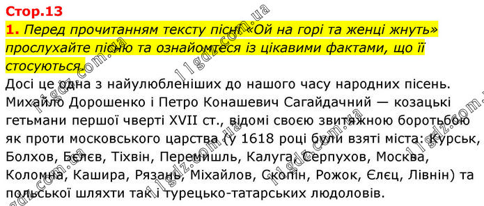 Перед прочитанням тексту пісні «Ой на горі та женці жнуть» прослухайте пісню та ознайомтеся із цікавими фактами, що її стосуються. Досі це одна з найулюбленіших до нашого часу народних пісень. Михайло Дорошенко і Петро Конашевич Сагайдачний — козацькі гетьмани першої чверті XVII ст., відомі своєю звитяжною боротьбою як проти московського царства (у 1618 році були взяті міста: Курськ, Болхов, Бєлєв, Тіхвін, Перемишль, Калуга, Серпухов, Москва, Коломна, Кашира, Рязань, Міхайлов, Скопін, Рожок, Єлєц, Лівнін) та польської шляхти так і турецько-татарських людоловів.